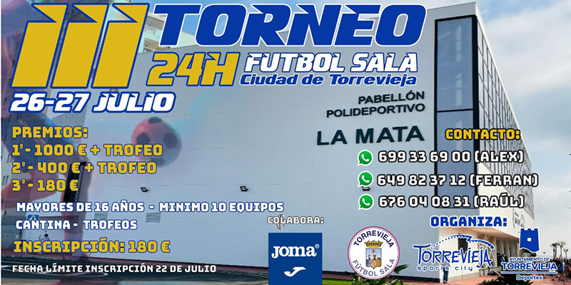 Hasta el 22 de julio están abiertas las inscripciones del III Torneo 24 horas de Fútbol Sala “Ciudad de Torrevieja”, organizado por el Torrevieja Fútbol Sala y la Concejalía de Deportes del Ayuntamiento de Torrevieja.