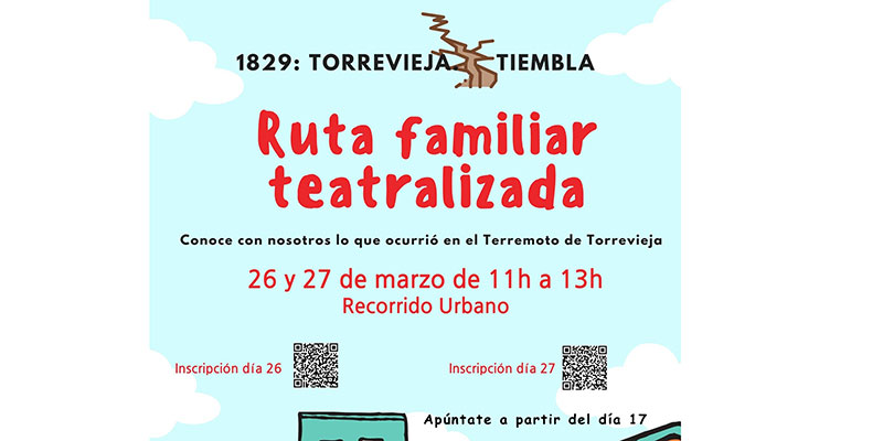 Como broche de oro, el sábado 26 y domingo 27 de marzo tendrá lugar la ruta familiar teatralizada ‘1829, Torrevieja Tiembla’ a cargo de Ars Creatio de la mano de Agamed y la Concejalía de Educación, con la colaboración de la Iglesia de la Inmaculada. Los asistentes podrán conocer la Torrevieja que sufrió el terremoto de 1829 de la mano de nueve personajes históricos que recrearán el acontecimiento. La ruta arrancará a las 11:00 horas desde la Plaza de la Constitución y transcurrirá durante poco más de dos horas por calles céntricas de Torrevieja en un circuito de 2 km. Las inscripciones están abiertas en https://www.inscribirme.com/rutafamiliarteatralizada1829torreviejatiembla.