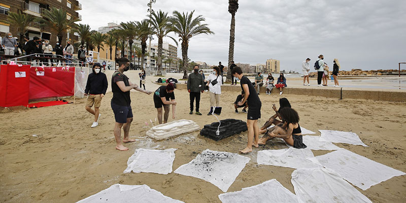 El Paseo Marítimo y las Piscinas Naturales fueron los testigos el pasado viernes 28 de mayo de la presentación de los dos últimos talleres del curso Cocinando Torrevieja. Dicho curso perteneciente al primer año de Grado de Arquitectura de la Universidad de Alicante ha estado formado por 120 alumnos y lo ha clausurado con la exposición de los dos últimos talleres. El primero de ellos llamado “Tupi or not tupi, that is the architecture”, tuvo lugar en el Paseo Marítimo Juan Aparicio desde las 11:00 a las 14:30. Se trataba de nueve performances y en las que podía participar el público asistente. A través de ellas interpretaron los principios del movimiento; centrados, en el reconocimiento de las sujeciones que coartan la arquitectura, y confiados en que la interpretación de una deglución figurada, facilitará el alumbramiento de nuevas perspectivas, todo ello con unas puestas en escena llamativas y transgresoras que atrajo a cientos de curiosos que al final terminaron implicándose gustosamente en las mismas.