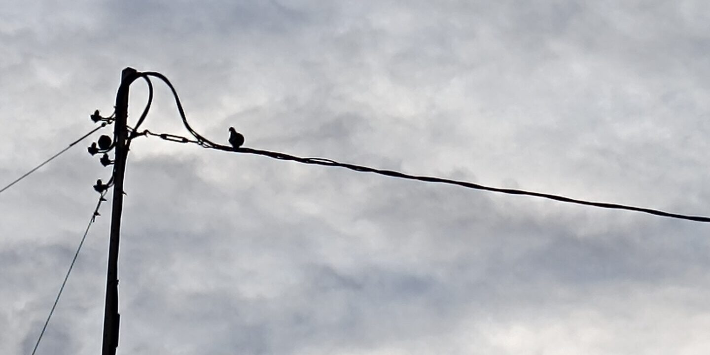Poste de luz con un pájaro solitario sobre el cable, en un cielo nublado de invierno. Imagen contemplativa que acompaña la columna “Cuaderno de invierno II” de Marco Antonio Torres Mazón, evocando recuerdos, melancolía y la quietud del invierno en Torrevieja.