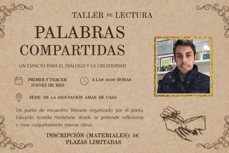 Cartel del taller de lectura “Palabras Compartidas”, coordinado por el poeta Eduardo Aranda Hortelano. Incluye su fotografía, la sede (Asociación Amas de Casa), el horario (primer y tercer jueves del mes a las 18:00 h) y la cuota de inscripción (5 €).