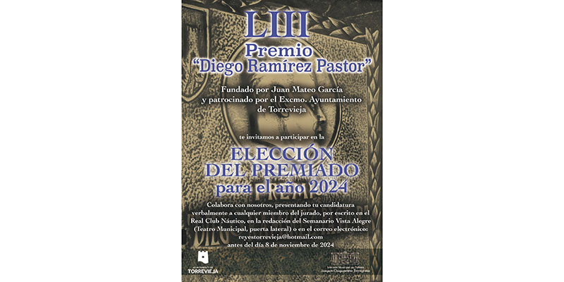 El Jurado, con el respaldo del Instituto Municipal de Cultura «Joaquín Chapaprieta Torregrosa», ha convocado la 53º edición del Premio «Diego Ramírez Pastor» que distingue a personas o entidades como reconocimiento a su labor altruísta en favor de Torrevieja y los torrevejenses. El galardón, fundado por el recordado, Juan Mateo García en homenaje al periodista, Diego Ramírez Pastor, impulsor del primer Día del Ausente, se decidirá este año el próximo día 8 de noviembre en la tradicional reunión del jurado que tendrá lugar en los salones del Real Club Náutico de Torrevieja. Todos los torrevejenses pueden presentar sus candidatos de manera verbal a cualquiera de los miembros del jurado, compuesto por los premiados de ediciones anteriores o bien entregándolo en la redacción del Semanario Vista Alegre, en el Teatro Municipal (puerta lateral), en el Real Club Náutico de Torrevieja o el correo electrónico reyestorrevieja@hotmail.com . El plano finaliza el mismo día de la reunión del jurado presidido por el alcalde de la ciudad y de la que es secretaria, Gema Mateo Bosch, hija del fundador. Como siempre la entrega se producirá en la noche de la víspera del día de La Purísima, patrona de la ciudad, en una gala que ha renovado su interés con el formato de los últimos años teniendo como escenario el hall del Auditorio Internacional.