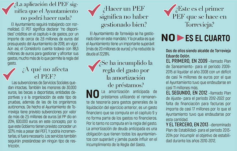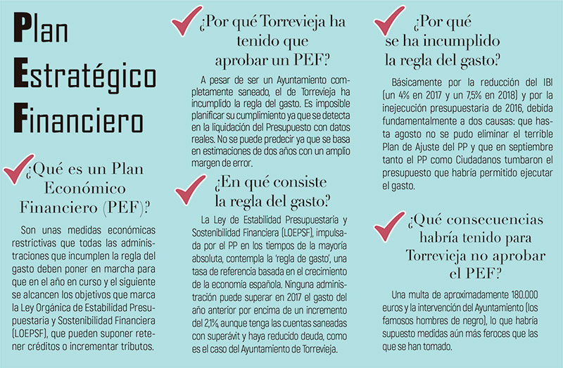 El Ayuntamiento se ha visto abocado a aprobar un PEF por incumplir la regla del gasto, “una de las normas más injustas a las que se enfrentan los Ayuntamientos del conjunto del Estado Español”, en palabras del edil de Hacienda, José Hurtado y “especialmente para aquellos que, como en el caso de Torrevieja tienen sus cuentas saneadas, con más de 20,5 millones de superávit en la liquidación de 2017 y una deuda de tan solo el 22,28%, sobre un 110% permitido”.