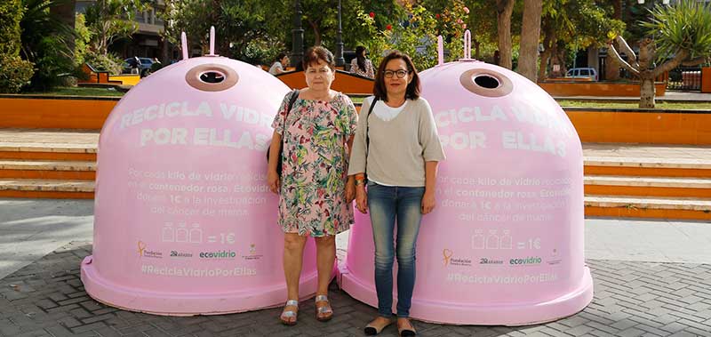 posaron junto a los contenedores ubicados en la Plaza de la Constitución. Ambas, que han superado un cáncer de mama, señalaron la importancia de campañas de este tipo. De hecho, animaron a más entidades y empresas a tomar iniciativas que sirvan para fomentar la investigación y para lograr una detección cada vez más