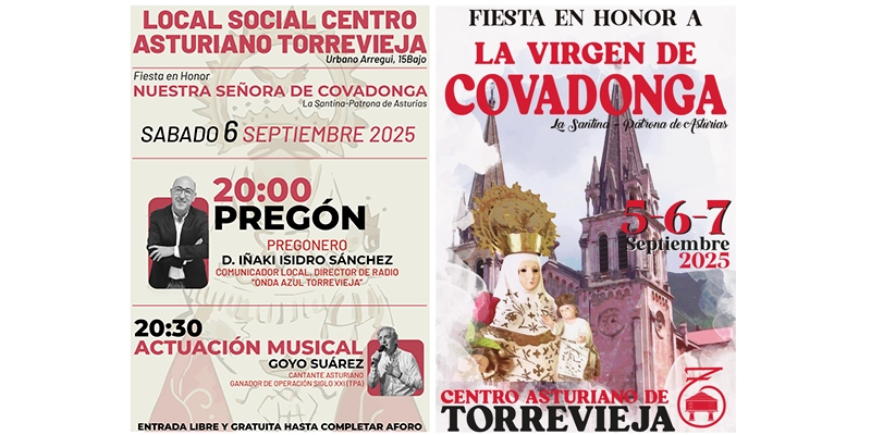 El Domingo día 7, víspera de la celebración oficial, el Centro Asturiano celebrará su Día Grande dedicado a la Virgen de Covadonga, La Santina. Los actos comenzarán a las 10:30 horas con la procesión – traslado de la imagen desde el local-sede del centro hasta la Parroquia de San Roque y Santa Ana, con el acompañamiento de las gaitas y tambores del grupo L´estruendu del Centro Asturiano de Alicante y a las 11, en la citada parroquia, se oficiará una Misa Solemne a cuya finalización tendrá lugar un mini concierto del grupo de gaitas con la música folklórica y tradicional de Asturias. A las 12:30 horas se iniciará la procesión de vuelta hacia el Centro Asturiano y a las 14:30 dará comienzo la tradicional comida de hermandad. Ese mismo día en el Centro Cultural «Virgen del Carmen», a las 20:00 horas, Festival Folklórico con la participación de la Agrupación Artística Gijonesa que, un año más ofrecerá las coreografías de su grupo de baile, dirigido por Paula Álvarez Cueto. Después se dará paso al Grupo de Teatro «Gigia» que pondrán en escena las obras «Ludivina la Adivina» y «El Forofo», con la dirección de Mery Suárez. La entrada será gratuita hasta completar el aforo del Centro Cultural. De esta forma se pondrá el broche final a estas festividades que unen a las comunidades asturiana y torrevejense cada año.