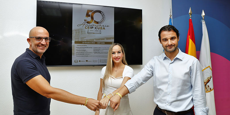 El alcalde de Torrevieja, Eduardo Dolón, el concejal de Educación, Ricardo Recuero, y la directora del CEIP Cuba, Ana María Torres, presentaron esta semana los actos programados el sábado, 22 de octubre, con motivo del 50 aniversario del colegio Cuba.