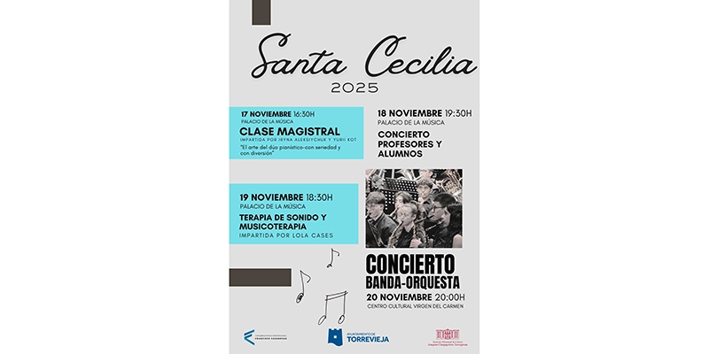 El Conservatorio Profesional de Música «Francisco Casanovas», con la colaboración del Instituto Municipal de Cultura «Joaquín Chapaprieta», ha preparado distintos actos y conciertos para conmemorar a la patrona de la música, Santa Cecilia. En el Palacio de la Música el 17 noviembre a las 16:30 h, tendrá lugar una Clase Magistral impartida por Iryna Aleksiychuk y Yurii Kot que llevará por título, “El arte del dúo pianístico: con seriedad y con diversión”. Al día siguiente 18 noviembre a las 19:30 h tendrá lugar un Concierto de Profesores y Alumnos. Y el 19 noviembre a las 18:30 h se llevará a cabo una Terapia de Sonido y Musicoterapia impartida por Lola Cases. Finalmente, el 20 de noviembre a las ocho de la tarde, en el Centro Cultural Virgen del Carmen se celebrará un concierto extraordinario de Banda–Orquesta dirigido por Francisco J. Garres Pérez.