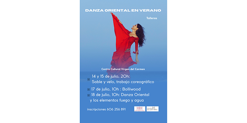 El Instituto Municipal de Cultura “Joaquín Chapaprieta” informa de la puesta en marcha de los Talleres de Danza Oriental en Verano, organizados por la Escuela Municipal de Danza Oriental. Los talleres de verano pretenden abarcar temáticas que no se han visto durante el curso para así complementar y enriquecer los aprendizajes adquiridos. De esta forma, este verano la escuela ofrece danza oriental con elementos como el sable o el velo, danza Bolliwood y la danza oriental a través de los elementos del fuego y del agua.