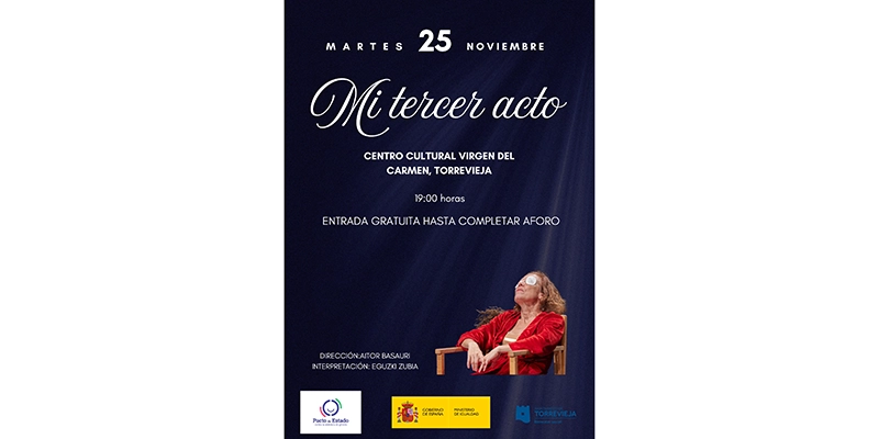 Ese mismo martes, a las 19:00 horas, en el auditorio del Centro Cultural Virgen del Carmen tendrá lugar la obra de teatro “Mi tercer acto”, una mirada propia en clave de humor, una epopeya tragicómica interpretada por la actriz, performer y profesora de artes escénicas Eguzki Zubia y producida por la compañía La Dinamika, dirigida por Aitor Basauri. La entrada es gratuita hasta completar aforo.
