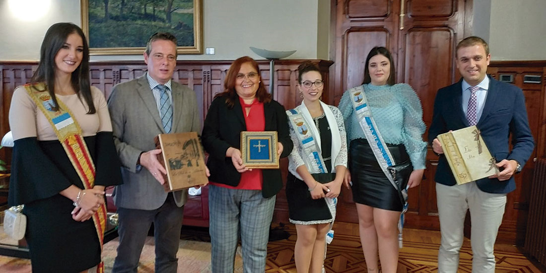 La Reina de la Sal, Cira Gualdo Prades y sus damas de honor, Carmen Maciá Gómez y Alba García Carrasco, han sido protagonistas de ésta primera década del hermanamiento de Torrevieja con las ciudades asturianas, cuyas conmemoraciones dieron inicio en el Ayuntamiento de la capital del Principado, Oviedo, donde fueron recibidas por el alcalde ovetense, Alfredo Canteli, conocedor de Torrevieja y quien se mostró dispuesto a profundizar en el hermanamiento. Junto al primer edil estuvo la concejala de Festejos, Covadonga Díaz. El acto se celebró en el salón de plenos del consistorio y allí fue instalada para la ocasión la bandera de Torrevieja junto a la de la capital del Principado de Asturias. Ambas delegaciones se intercambiaron unos presentes y tras unas palabras del alcalde, la edil salinera, Concha Sala, invitó en nombre del alcalde de Torrevieja al gobierno de Oviedo a que visite Torrevieja en un futuro, que bien podría ser coincidiendo bien con las fiestas patronales o con la celebración del Certamen Internacional de Habaneras el cual el alcalde Canteli conoce por haber asistido en alguna ocasión.