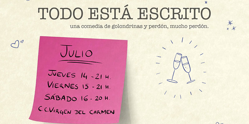 El Centro Cultural Virgen del Carmen acogerá los días 14, 15 y 16 de julio una nueva comedia de Pedro Antonio Albaladejo Aniorte para los/as alumnos/as de la escuela de teatro de La Cueva de Melpómene, bajo el título ‘Todo está escrito’.
