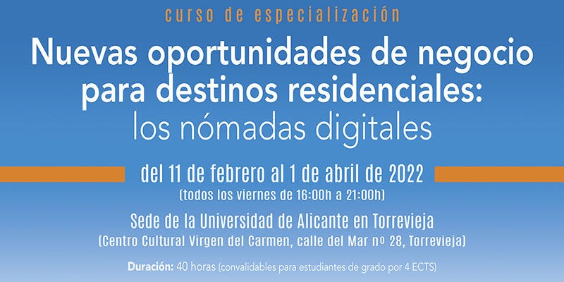 La sede de la Universidad de Alicante en Torrevieja ha puesto en marcha el curso de especialización bajo el título «Nuevas oportunidades de negocio para destinos residenciales: los nómadas digitales». El curso, que contará con 4 créditos para Grados, se impartirá del 11 de febrero al 1 de abril de 2022 en el aula de la Sede Universitaria del Centro Cultural Virgen del Carmen.
