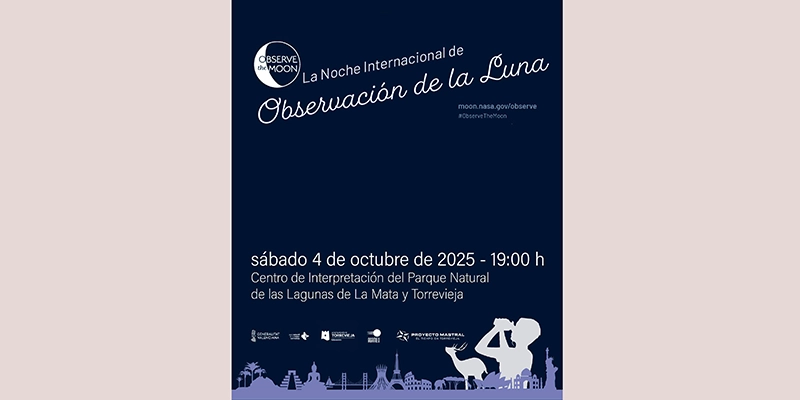 Hoy sábado, 4 de octubre, se celebra la Noche Internacional de Observación de la Luna, un evento impulsado por la NASA y seguido en todo el mundo. Con tal motivo, Proyecto Mastral organiza una observación de la Luna, que dará comienzo a las 19:00 horas y se alargará hasta las 21:30 horas, en el Centro de Interpretación del Parque Natural de las Lagunas de La Mata y Torrevieja. Se trata de una actividad gratuita y apta para todos los públicos.