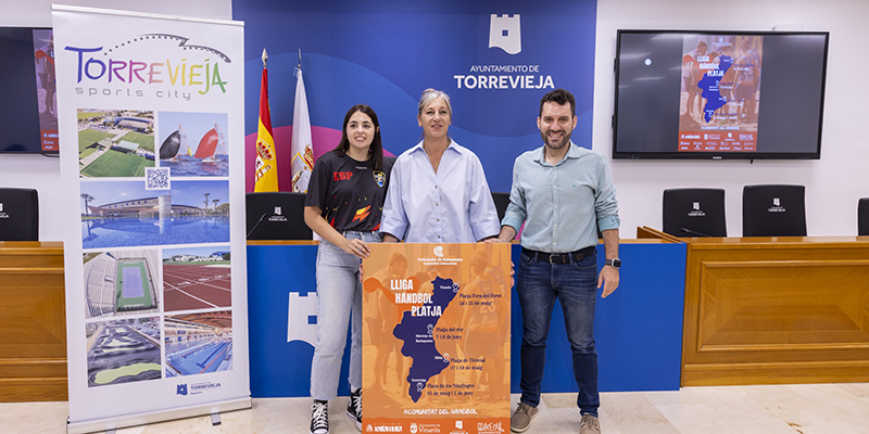 La concejal de Deportes, Diana Box Alonso, el responsable de Proyectos de la Federación de Balonmano de la Comunidad Valenciana, Miguel Soria, y la responsable del equipo ejecutivo del Club Balonmano Playa Rayito Salinero, Irene Mercader, presentaron el programa de la penúltima jornada de la Liga de Balonmano Playa Comunidad Valenciana, que se celebra hoy sábado, 31 de mayo, y este domingo, 1 de junio, en la playa de Los Náufragos de Torrevieja. El ganador del torneo participará en el campeonato Arena 1000 de Cádiz (Circuito Nacional).