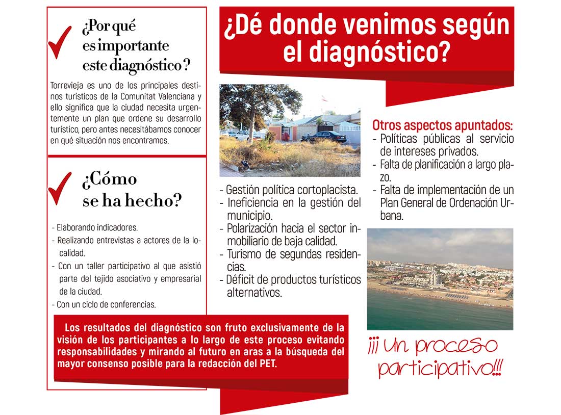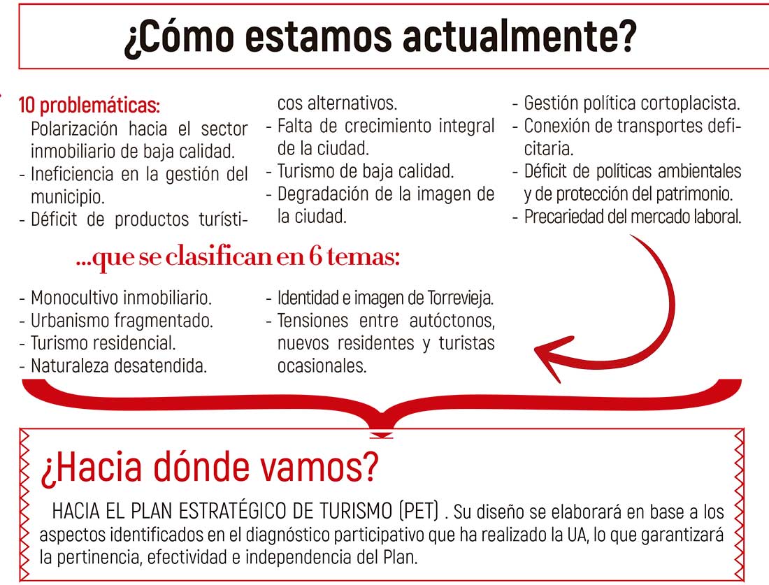 La ciudad ha dado un paso más en la elaboración de su Plan Estratégico de Turismo (PET). La hoja de ruta de la futura política turística de la ciudad se apoyará en el diagnóstico participativo que ha realizado el equipo de investigadores del Instituto Universitario de Investigaciones Turísticas de la UA y que se presentó la semana pasada.