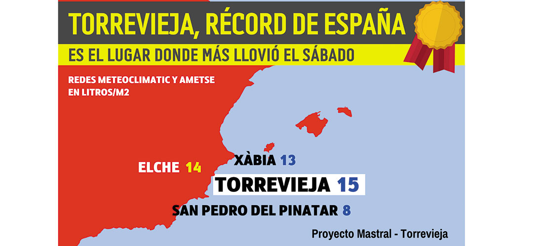 Torrevieja fue la ciudad de toda España en la que más lluvia se recogió el pasado sábado, 22 de enero, según las redes de Meteoclimatic y Ametse. Ese día la ciudad registró hasta 15 litros por metro cuadrado, según informó Proyecto Mastral – www.eltiempoentorrevieja.es. Elche se quedó cerca con 14 l/m2 y Xàbia con 13 l/m2.
