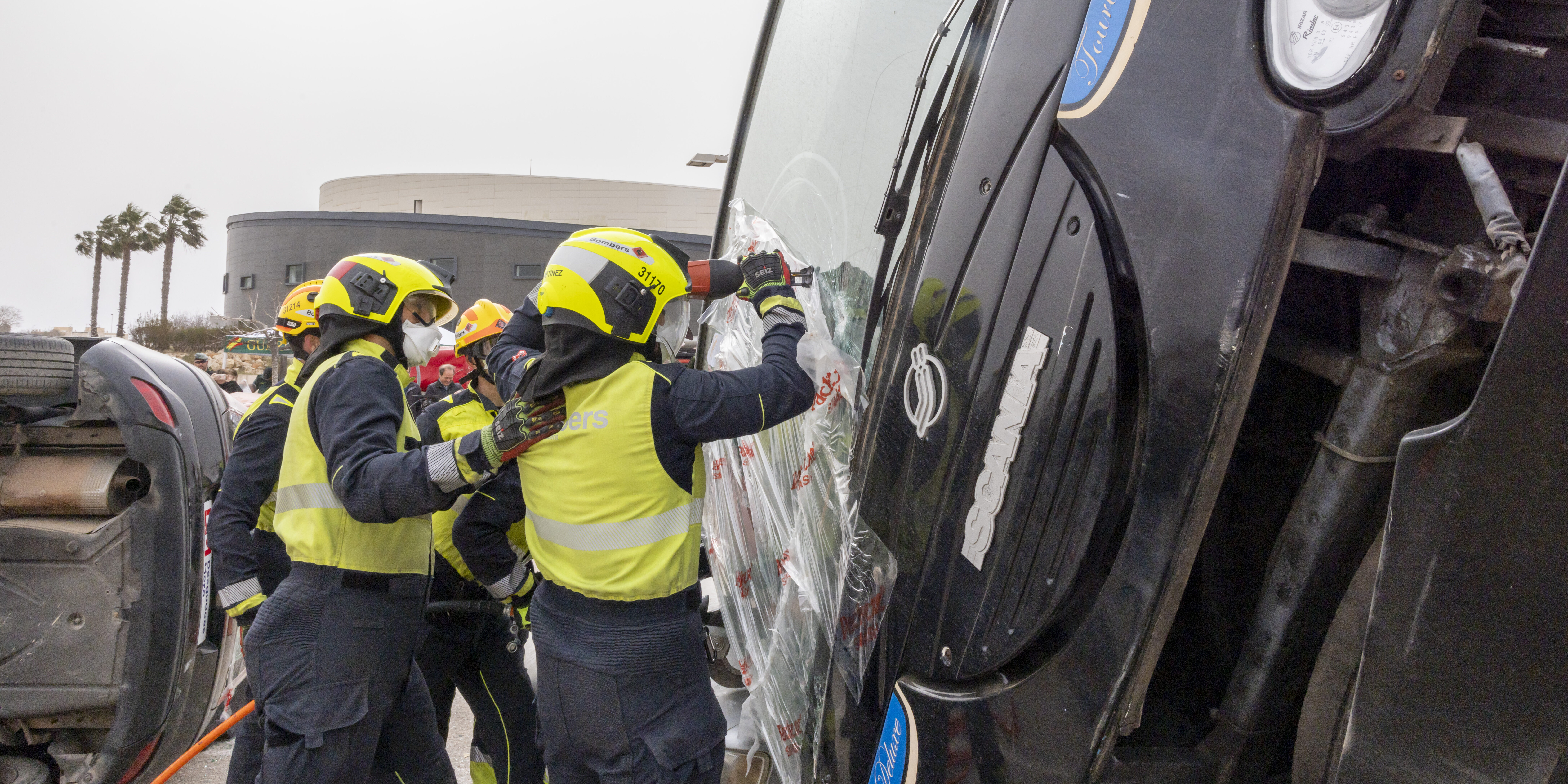 El simulacro ha incluido distintas intervenciones prácticas. Los bomberos han realizado una demostración de excarcelación de heridos atrapados en el interior de un vehículo, mostrando el protocolo de actuación y el uso del material especializado.