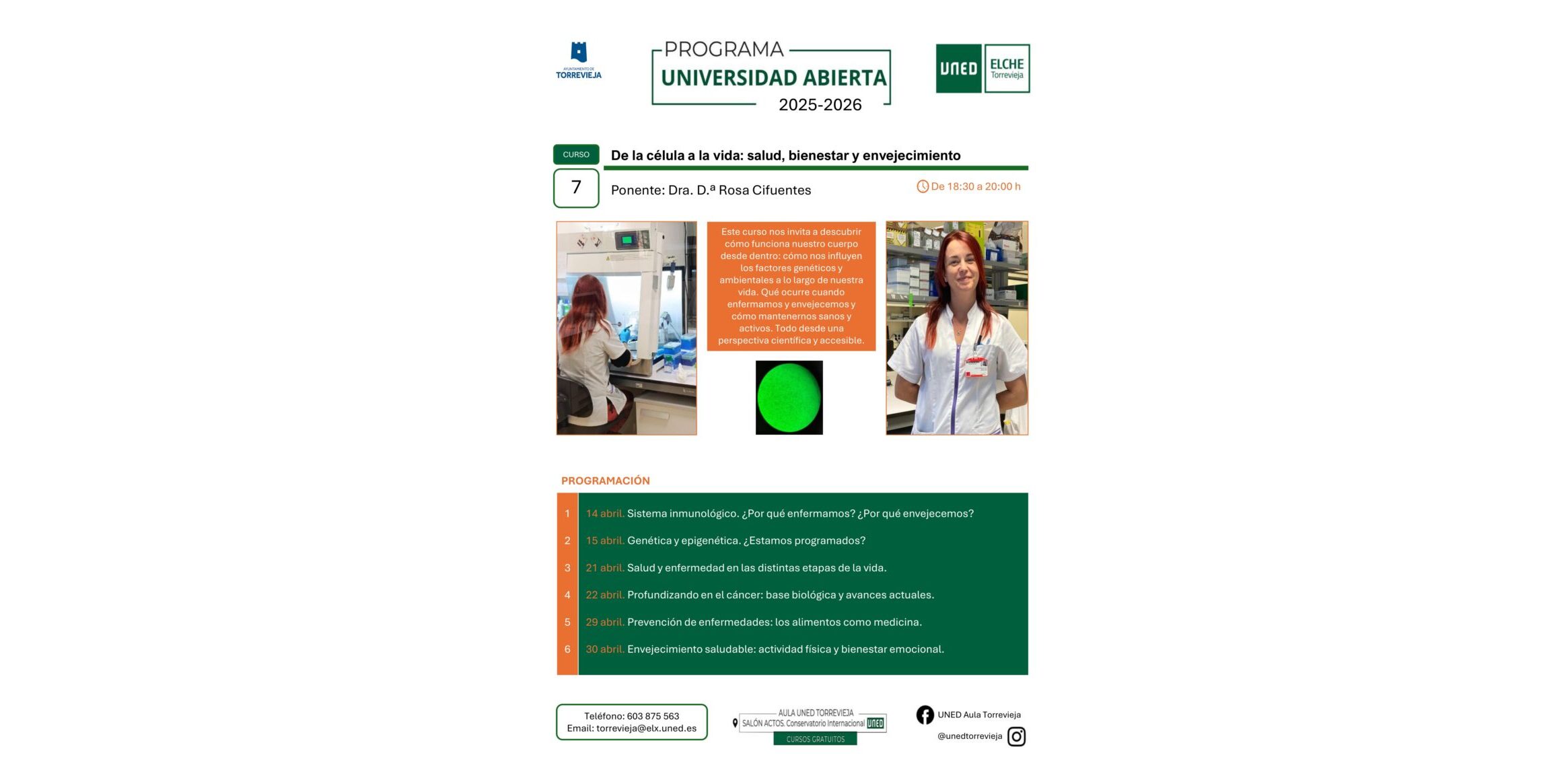 Con el título De la célula a la vida: seminarios sobre salud, bienestar y envejecimiento se reanudan las actividades del programa Universidad Abierta para mayores del Aula UNED Torrevieja el próximo martes, 14 de abril. Las seis sesiones del curso se realizarán en la sede provisional de la UNED torrevejense en el Conservatorio Internacional, durante el presente mes de abril, en su horario habitual: de 18:30 a 20:00 horas.